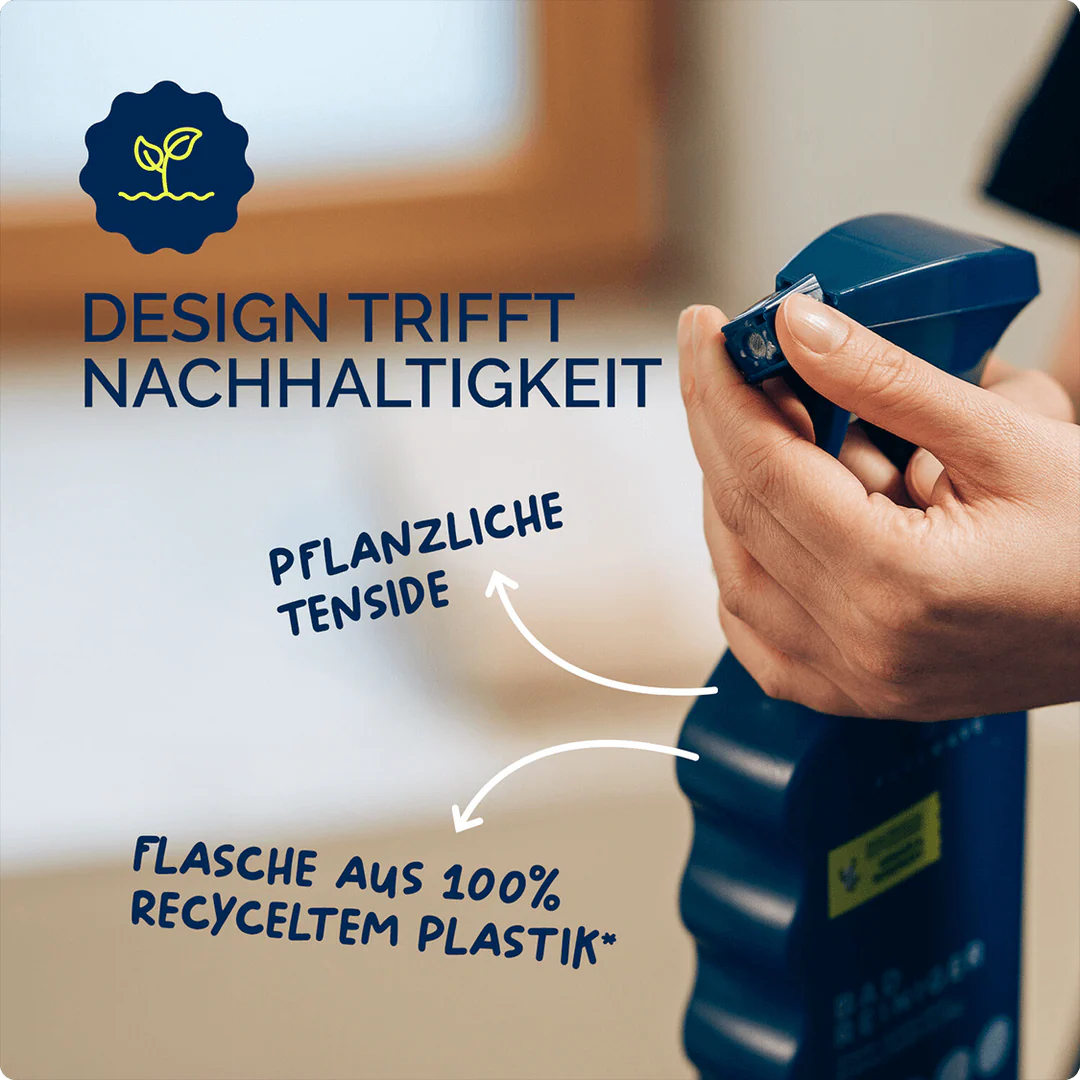 Verpackung: Der Flaschenkörper des Reinigers besteht zu 100% aus recyceltem Altplastik, sogenanntem Post-Consumer-Recyclat, und ist auch zu 100% wieder recycelbar.
