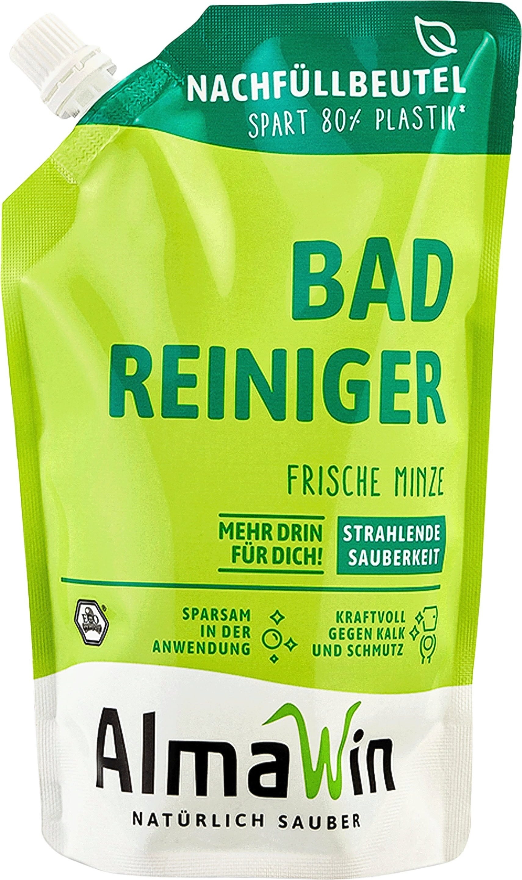 De eco-gecertificeerde badkamerreiniger is geschikt voor alle zuurbestendige oppervlakken in de badkamer. Het lost alle soorten vuil op, evenals kalk- en zeepresten, en laat een frisse, muntachtige geur achter.
