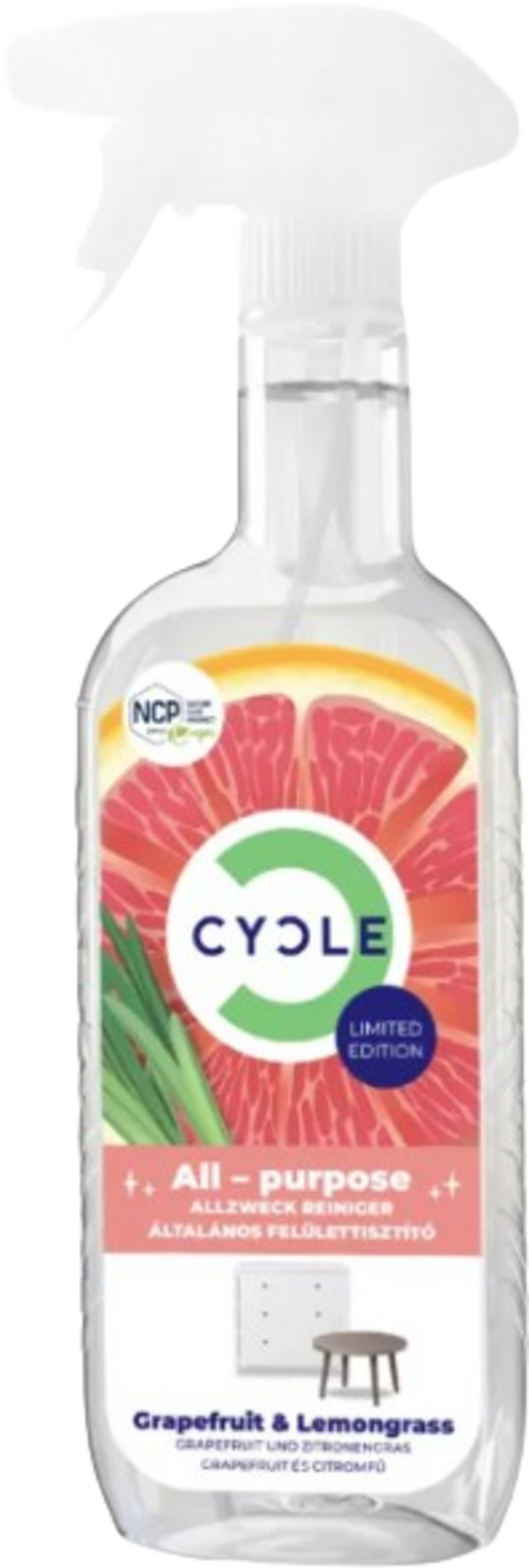 De allesreiniger van CYCLE reinigt verschillende oppervlakken met een krachtige formule gemaakt van gerecyclede ingrediënten. De geur vult je kamers met de zomerse citrusfrisheid van grapefruit en citroengras.